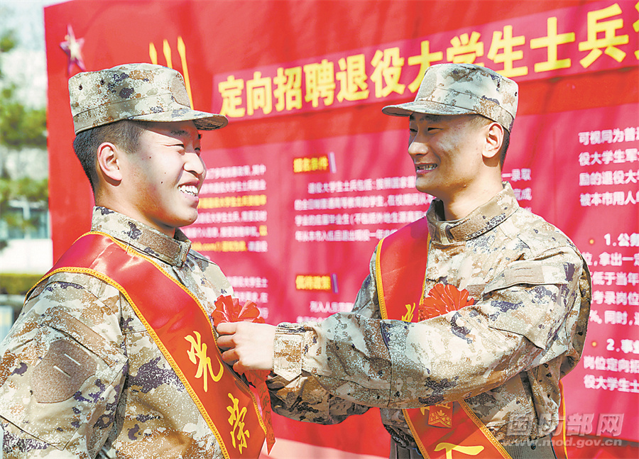 3月15日,北京市石景山區(qū)人武部舉行2024年上半年新兵入伍歡送儀式。圖為新兵互戴大紅花。高建南攝