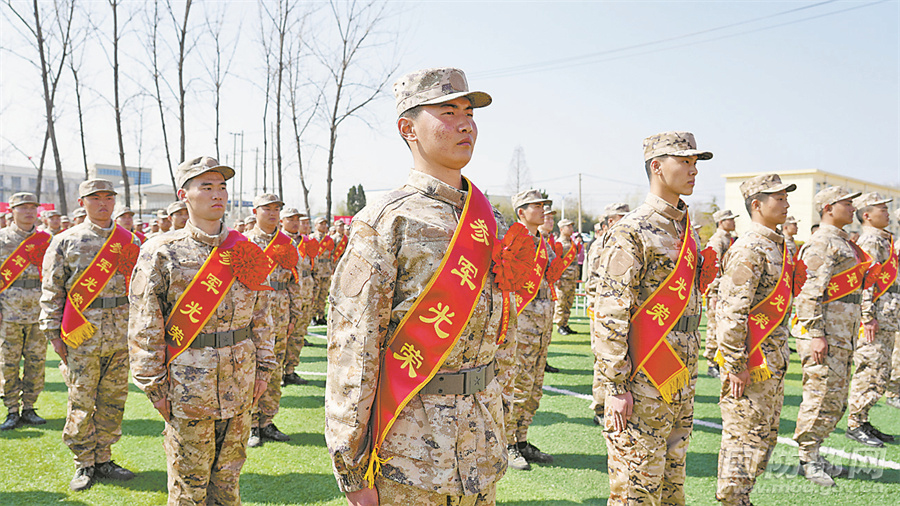 3月15日,江蘇省豐縣在縣民兵訓練基地舉行上半年新兵入伍歡送儀式,全體新兵披綬帶、戴紅花,整裝待發。楊甜甜攝