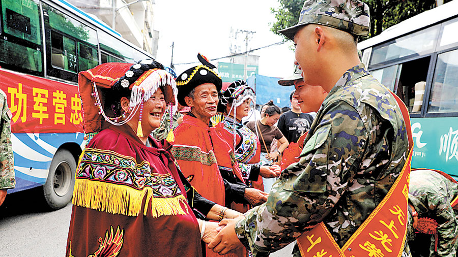 貴州省畢節市七星關區少數民族群眾來到送兵現場歡送新兵