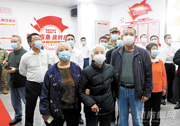 張苞烈士遺孀曾解(前排左二)和家人在張苞民兵連參觀。