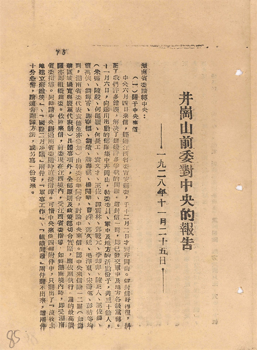 圖為《井岡山前委對中央的報(bào)告》首頁,該報(bào)告收錄在1945年中共山東分局印發(fā)的《黨的路線問題選集》。 解放軍檔案館提供
