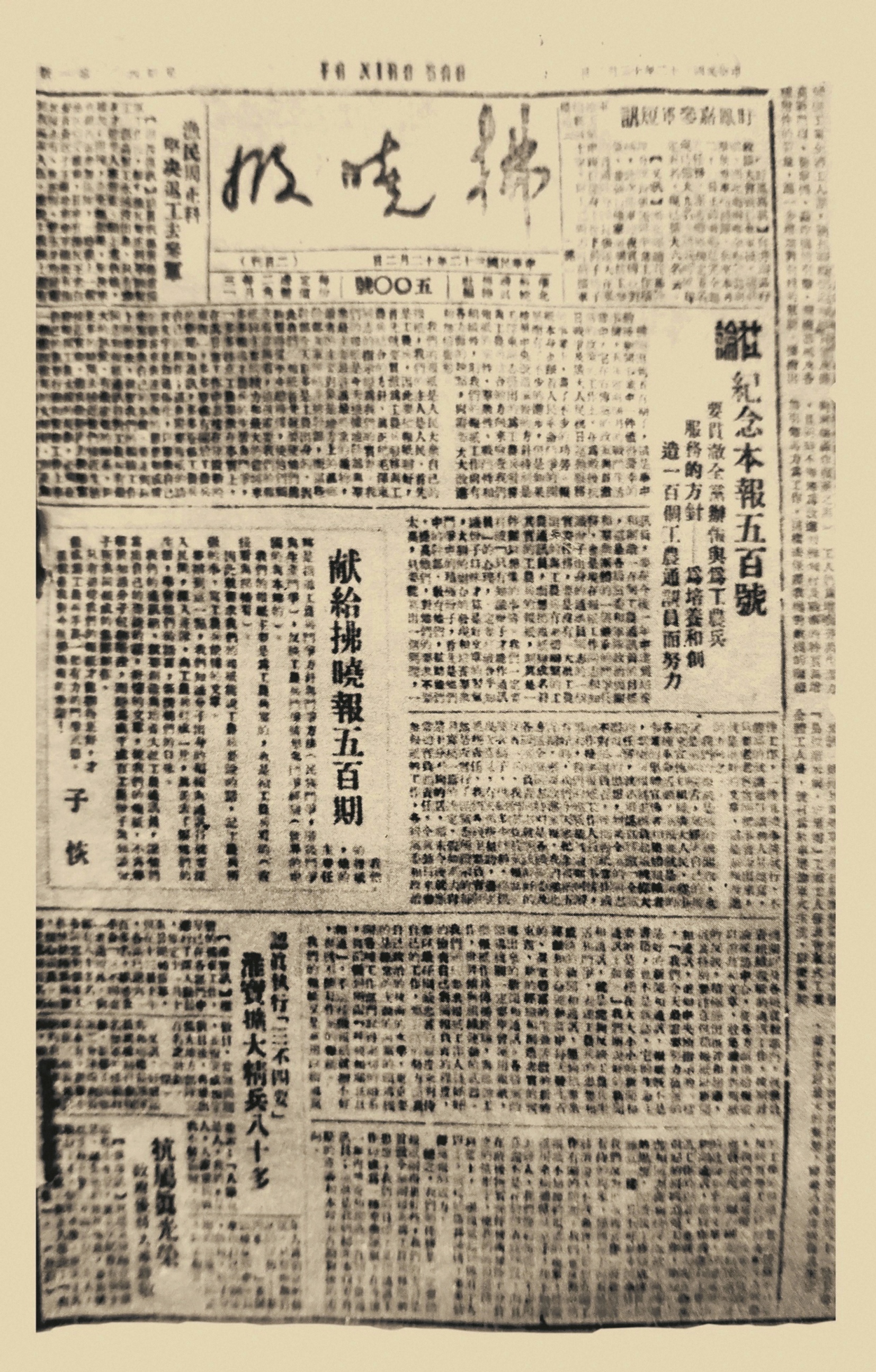 1943年12月2日,在《拂曉報》出版500期時,彭雪楓洋洋灑灑寫了5000字的《賀拂曉報五百號——五年來拂曉報的檢討》,為《拂曉報》“祝壽”。文中,他將《拂曉報》“堅持5年零2個月的長期過程而不懈”,稱為“在希望之中而又很出意料之外”的奇跡。為了寫這篇文章,他把490多期《拂曉報》全部翻了一遍。