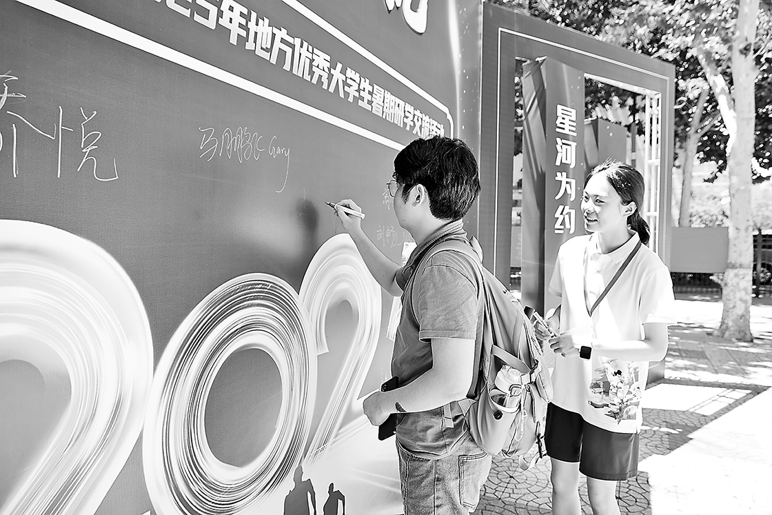 航天工程大學研究生院組織暑期研學交流活動,大學生們在簽到墻上簽名。于 寧攝