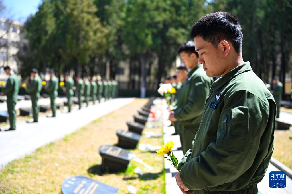 4月2日,海軍航空大學某團組織飛行學員在太行太岳烈士陵園開展清明祭掃活動。