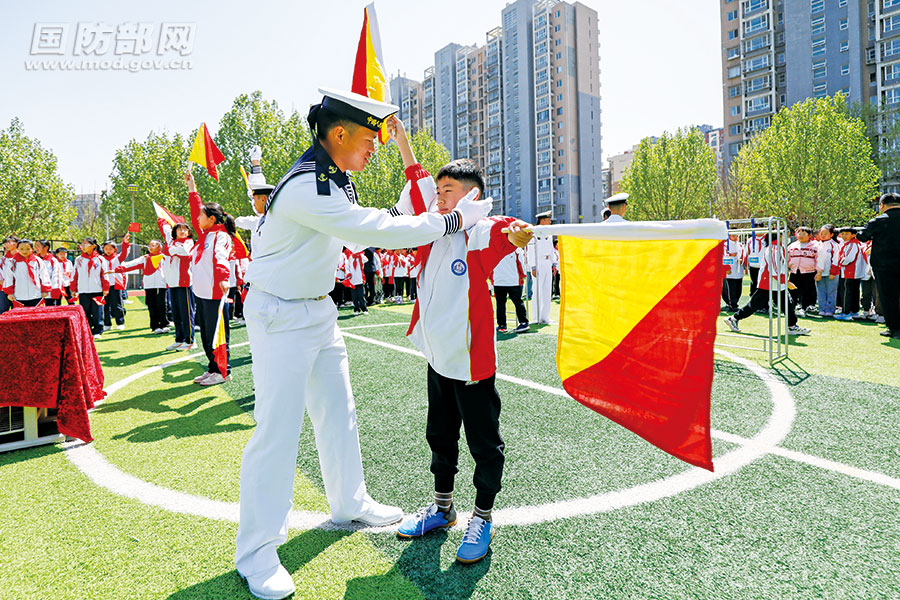 為慶祝人民海軍成立七十五周年,四月二十四日,海軍唐山艦官兵走進河北省唐山市雷鋒小學開展國防教育活動。