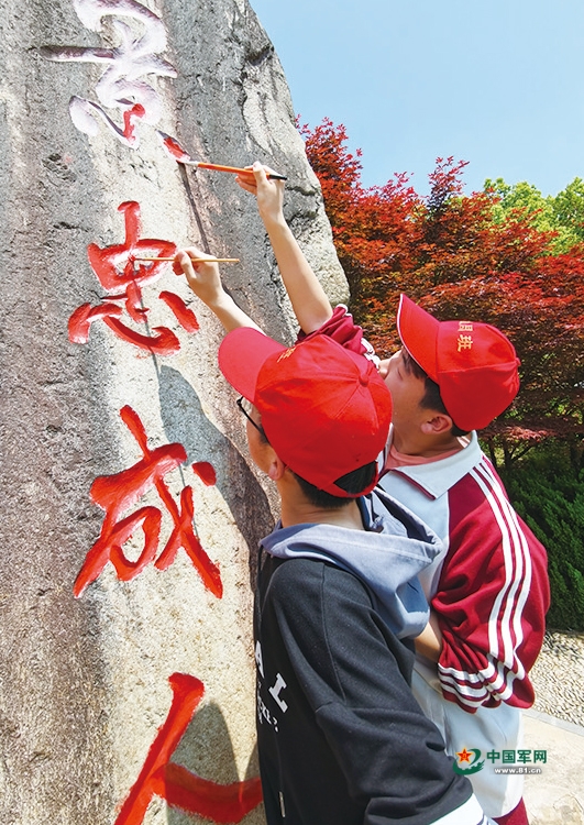 野寨中學學生為“景忠成人”校訓石描紅。野寨中學供圖