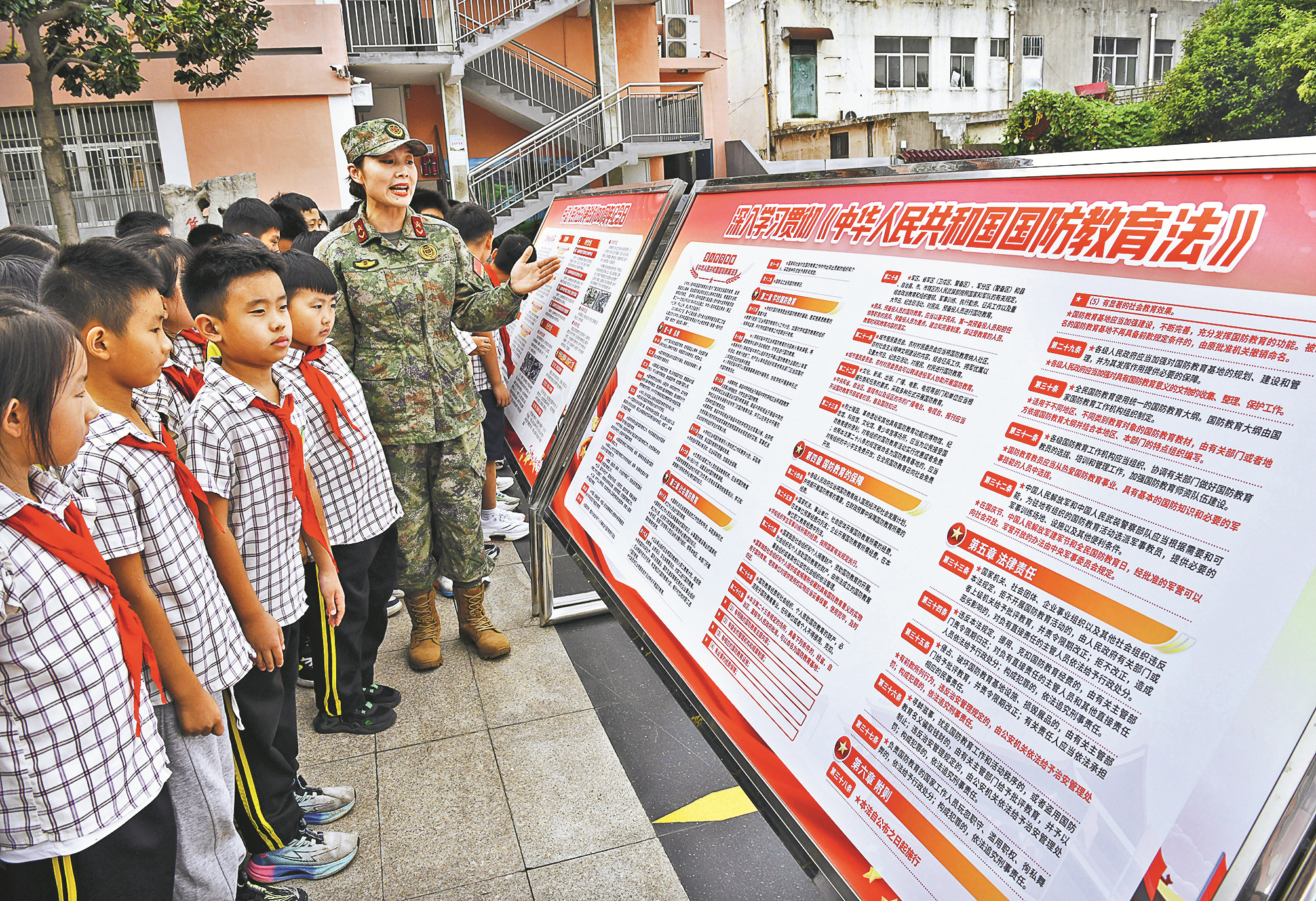 近日,山東省棗莊市山亭區(qū)“王家灣鐵姑娘民兵連”民兵走進(jìn)該區(qū)第一實(shí)驗(yàn)小學(xué)開(kāi)展國(guó)防教育。曹耕萌 攝