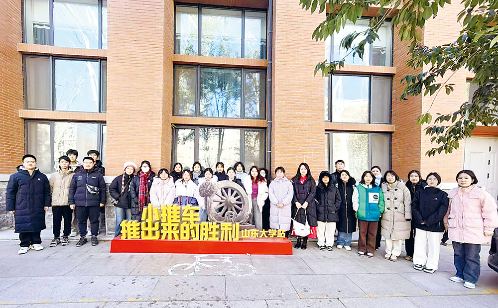 2024年12月19日,“小推車推出來的勝利——淮海戰役支前文物展”在山東大學巡展時,該校部分師生在展館入口留影。崔育寧攝