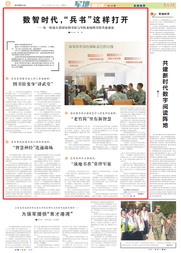 近兩年來,國家圖書館在繼續(xù)推進軍隊系統(tǒng)分館建設(shè)之外,還幫助多個軍隊系統(tǒng)圖書館與駐地市、縣圖書館結(jié)成資源共同體,打造“悅讀驛站”、流動圖書車、戰(zhàn)地小書箱等模式,助力軍地圖書信息資源共享,提升軍隊圖書館數(shù)字化水平,引導(dǎo)官兵養(yǎng)成閱讀習(xí)慣。