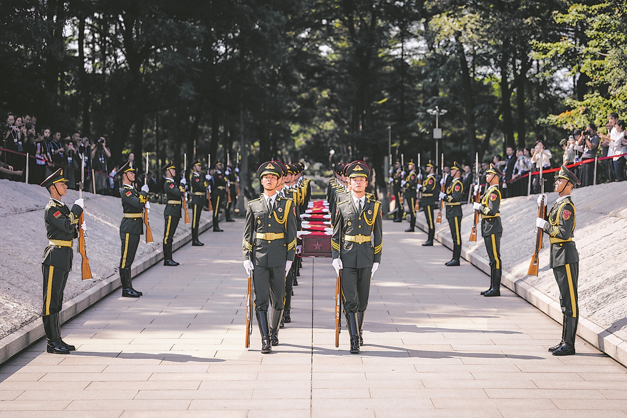 10時許,軍樂隊奏響低沉悠揚的《思念曲》,在解放軍儀仗司禮大隊戰士的持槍護衛下,22名禮兵邁著穩健的步伐,緩緩護送覆蓋著五星紅旗的烈士遺骸棺槨進入紀念廣場。棺槨被輕輕安放于軍綠色絨布鋪設的停放臺上,莊嚴的中華人民共和國國歌隨即響起,人們高聲齊唱。