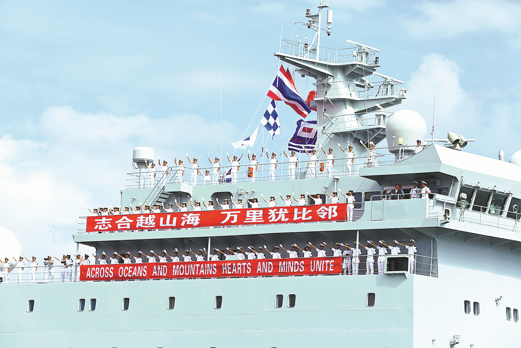 戚繼光艦官兵在泰國梭桃邑港向民眾致意。新華社發(fā)