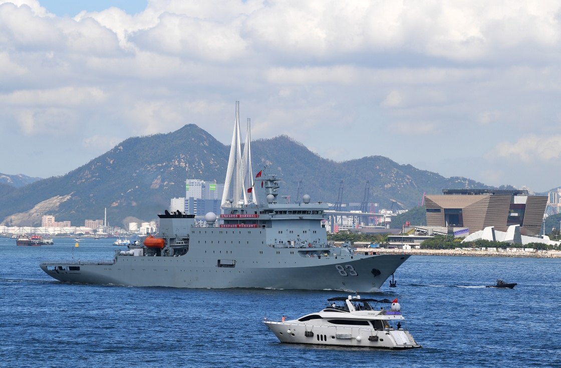 10月3日上午,中國海軍83艦編隊離開香港,結束為期3天的艦艇開放活動。根據遠海綜合實習訪問任務計劃,將啟程訪問柬埔寨、泰國、新加坡3國。新華社記者 陳鐸 攝