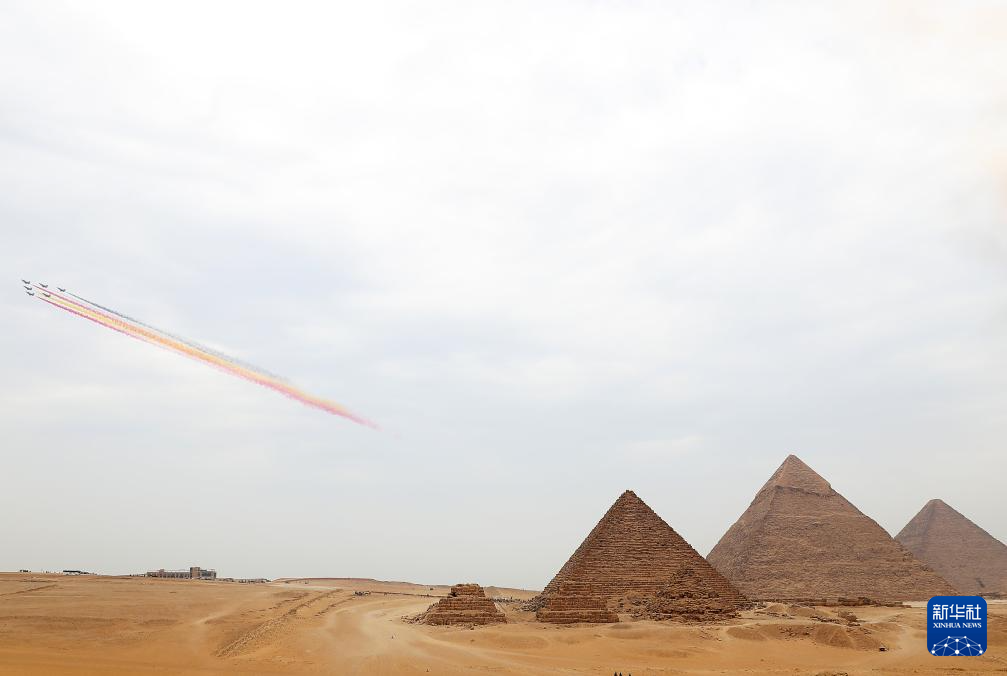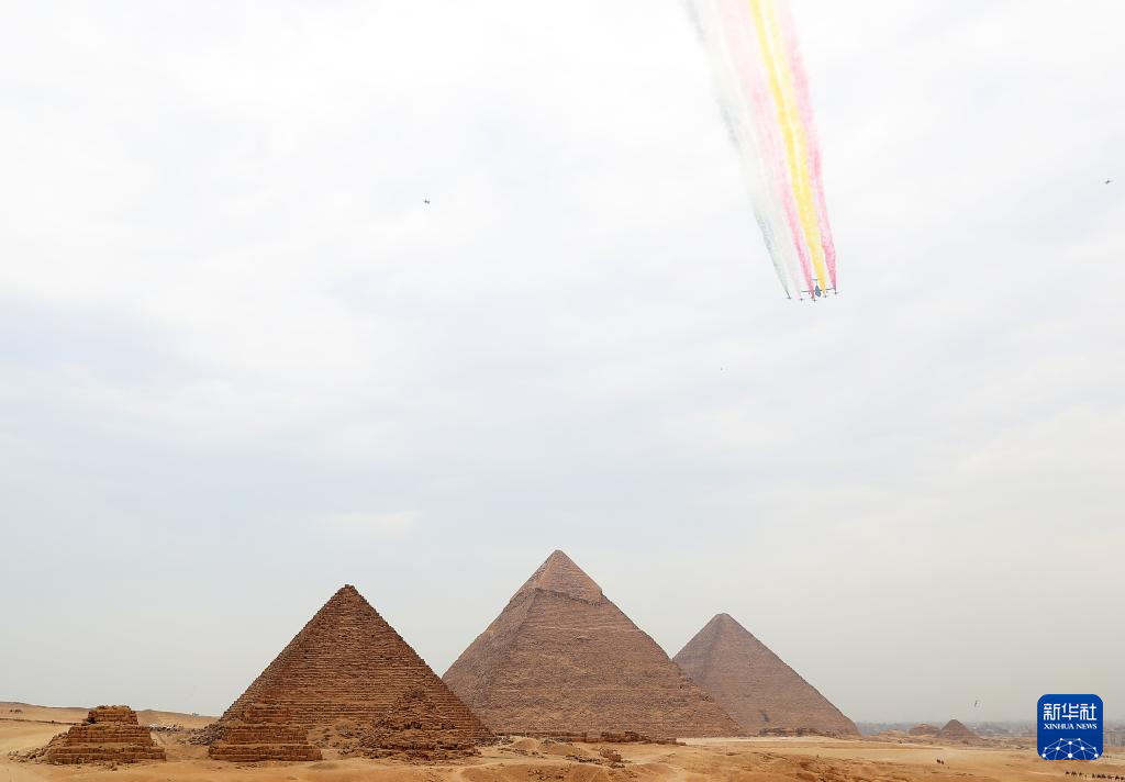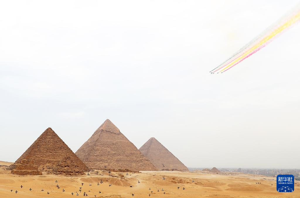 8月28日,在埃及吉薩金字塔景區(qū),中國空軍八一飛行表演隊(duì)殲-10表演機(jī)編隊(duì)飛越金字塔上空。新華社記者 隋先凱 攝
