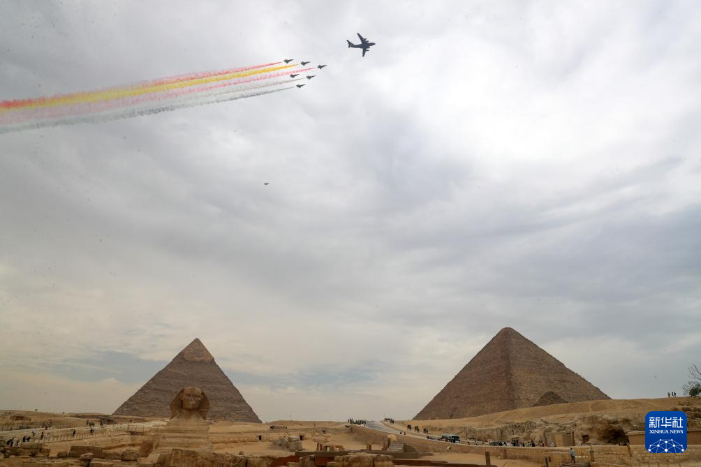 當(dāng)?shù)貢r(shí)間28日中午,中國空軍1架運(yùn)-20與空軍八一飛行表演隊(duì)6架殲-10表演機(jī)編隊(duì)飛越金字塔上空,殲-10表演機(jī)在空中拉出象征中埃兩國國旗顏色的6道彩煙,吉薩金字塔景區(qū)內(nèi)的觀眾爭(zhēng)相合影留念。