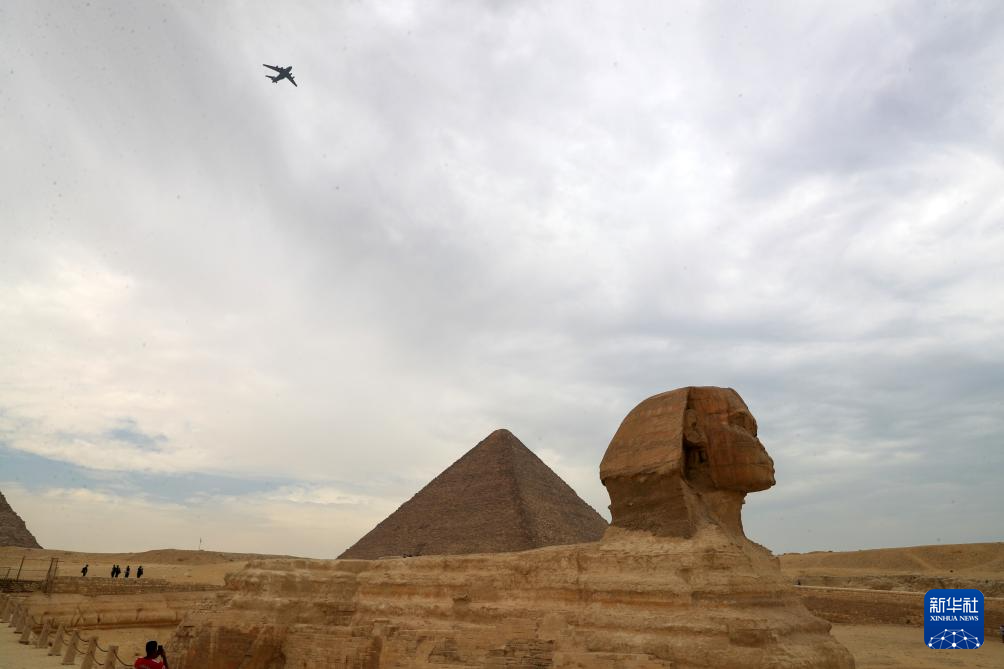 8月28日,在埃及吉薩金字塔景區(qū),中國空軍運(yùn)-20飛越金字塔景區(qū)上空。新華社記者 隋先凱 攝