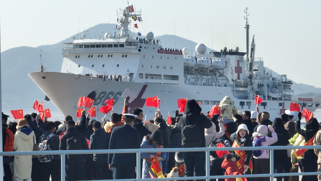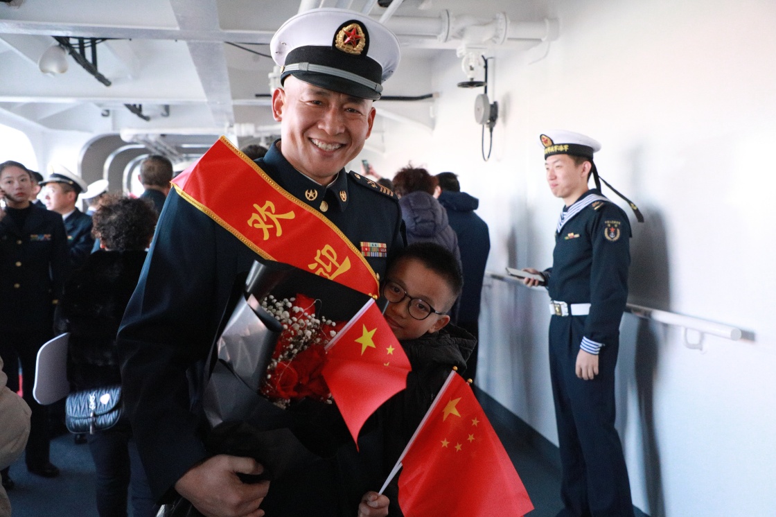 1月16日,中國海軍“和平方舟”號醫院船圓滿完成“和諧使命-2024”任務,順利返回浙江舟山某軍港,官兵家屬登船與親人團聚。新華社記者 李秉宣 攝