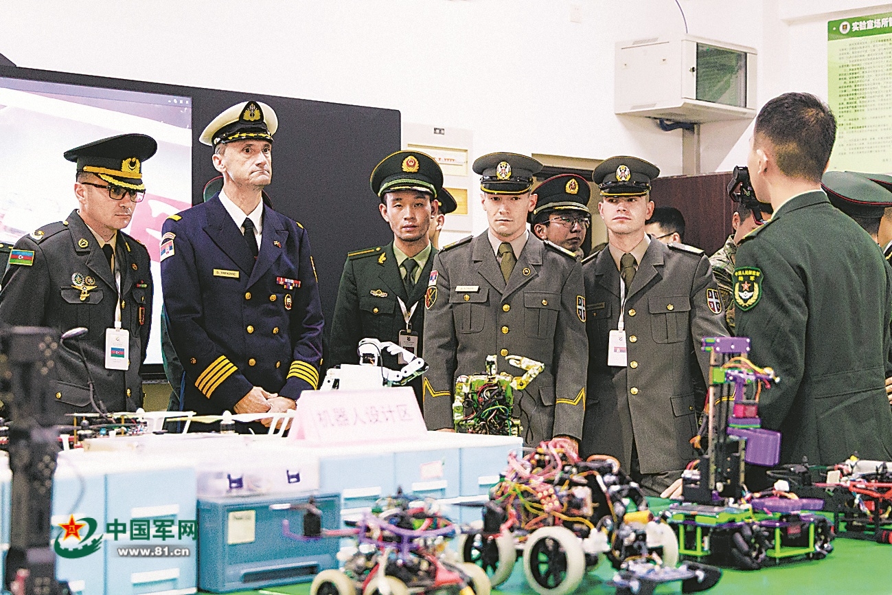 在觀看完精彩紛呈的機器人擂臺對抗賽后,學員們移步至俱樂部的裝備測試演示區。水下“探索者”、陸地巡航車、智能搬運機器人……各式各樣的機器人相繼亮相。其中,體感格斗機器人前圍滿了駐足體驗的外軍學員。體驗者在穿戴體感設備后,動作姿態便被系統實時捕捉,并同步驅動機器人完成揮拳、轉向、防御等格斗動作。來自摩洛哥的學員阿尤布體驗后興奮地說:“操作直觀流暢,就像玩體感游戲一樣!如果將這款可遠程實時操控并能準確完成精細動作的機器人,應用于掃雷排爆等高危場景,相信會給人們帶來很大幫助。”