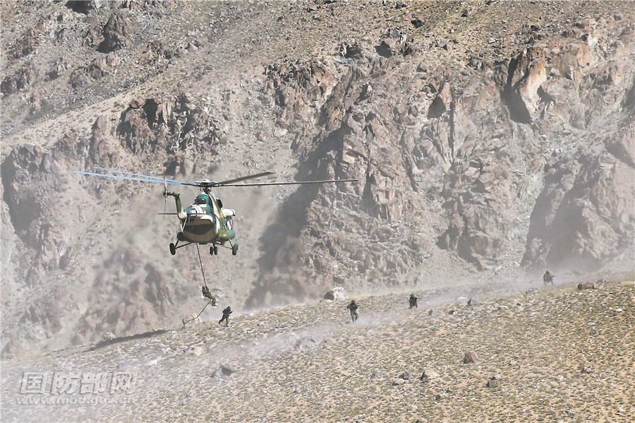 直升機(jī)搭載特戰(zhàn)隊(duì)員實(shí)施機(jī)降。