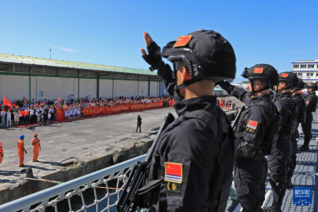 當地時間9時許,懸掛著中馬兩國國旗的編隊艦艇烏魯木齊艦、臨沂艦和東平湖艦緩緩駛入馬達加斯加圖阿馬西納港。馬達加斯加軍方代表,中國駐馬達加斯加大使館工作人員、華僑華人等300余人到碼頭迎接。