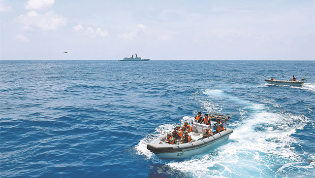 中國海軍護航編隊在亞丁灣某海域組織反恐反海盜演練