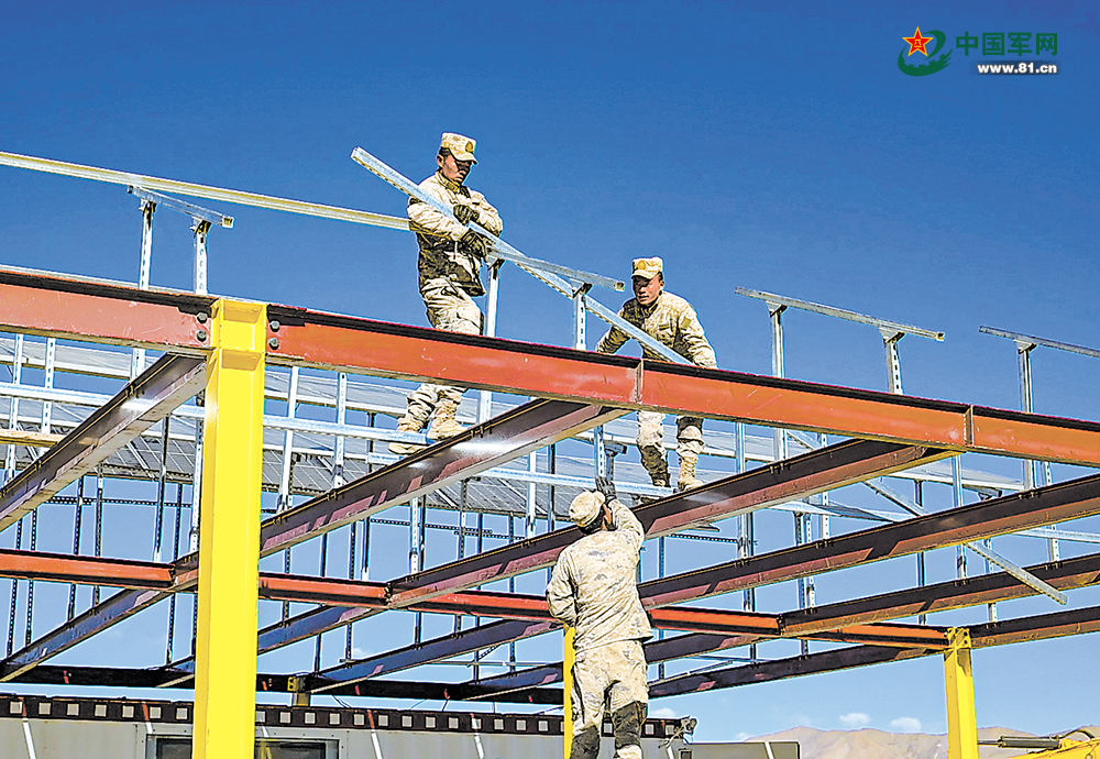 夜幕降臨,簡易廁所、供水站等生活保障設施仍在加緊施工中。官兵身后,一排排保溫板房里的點點光亮,透出別樣的溫暖。