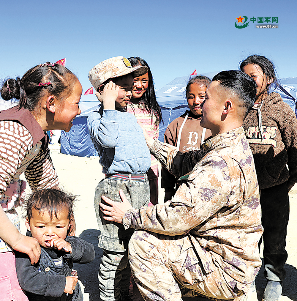 1月11日,西藏軍區某部官兵在長所鄉雜村受災群眾安置點與兒童暖心互動。李建驕攝