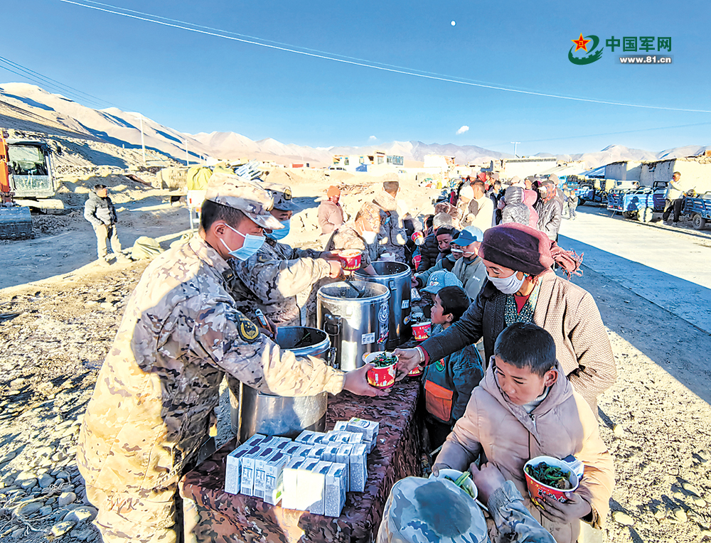 1月11日,武警西藏總隊官兵在曲洛鄉措娃村為受災群眾分發熱食。劉 鵬攝