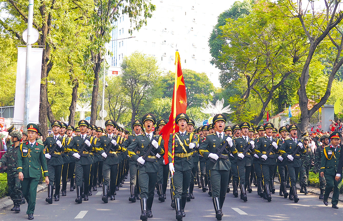 4月30日,解放軍儀仗司禮大隊儀仗分隊在胡志明市參加越南紀念南方解放50周年慶典活動。閆旭磊 攝