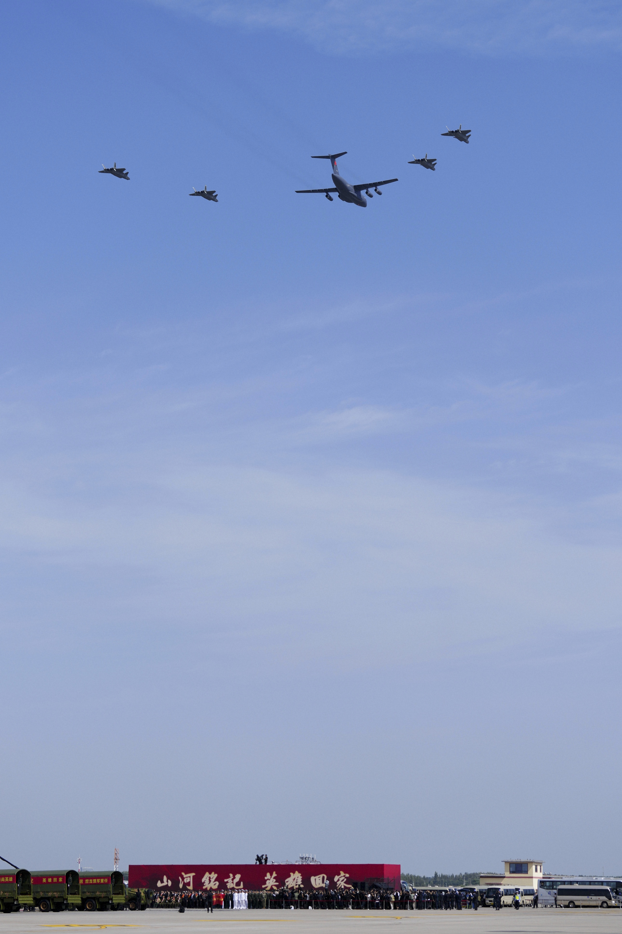 9月12日,第十二批在韓中國人民志愿軍烈士遺骸回國。這是在沈陽桃仙國際機場,接運烈士遺骸回國的運-20專機在4架殲-20飛機伴飛護航下即將降落。新華社發(fā)(楊盼 攝)