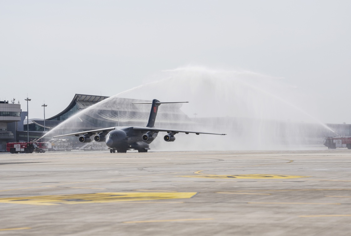 9月12日,第十二批在韓中國人民志愿軍烈士遺骸回國。這是在沈陽桃仙國際機場,接運烈士遺骸回國的運-20專機通過水門。 新華社記者 潘昱龍 攝