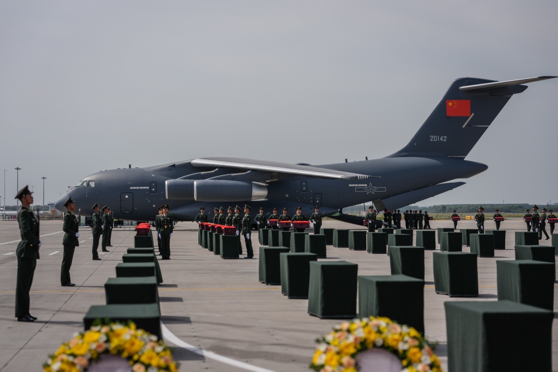 9月12日,第十二批在韓中國人民志愿軍烈士遺骸回國。這是在沈陽桃仙國際機場,接運烈士遺骸回國的運-20專機即將降落。新華社記者 潘昱龍 攝