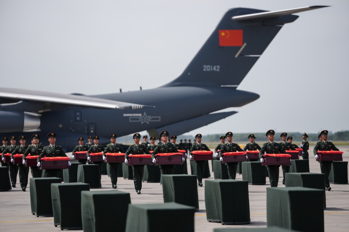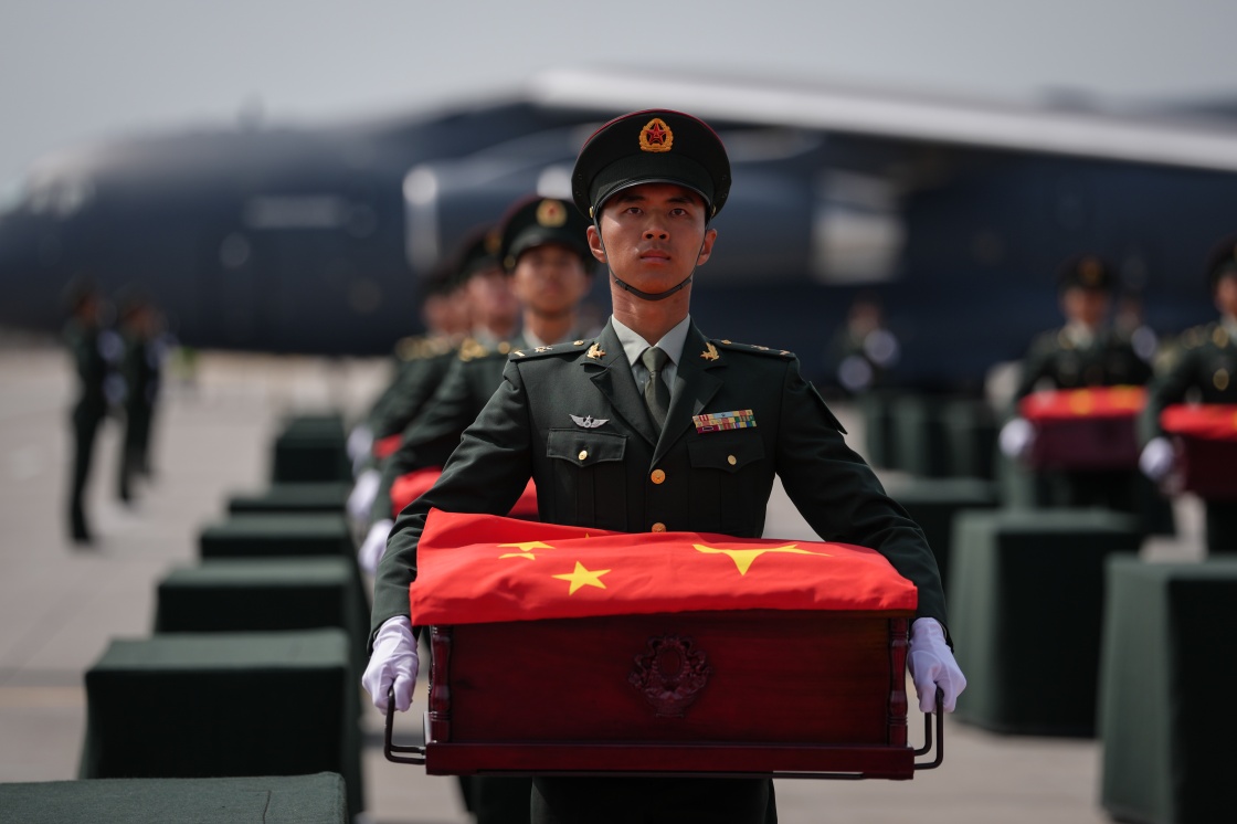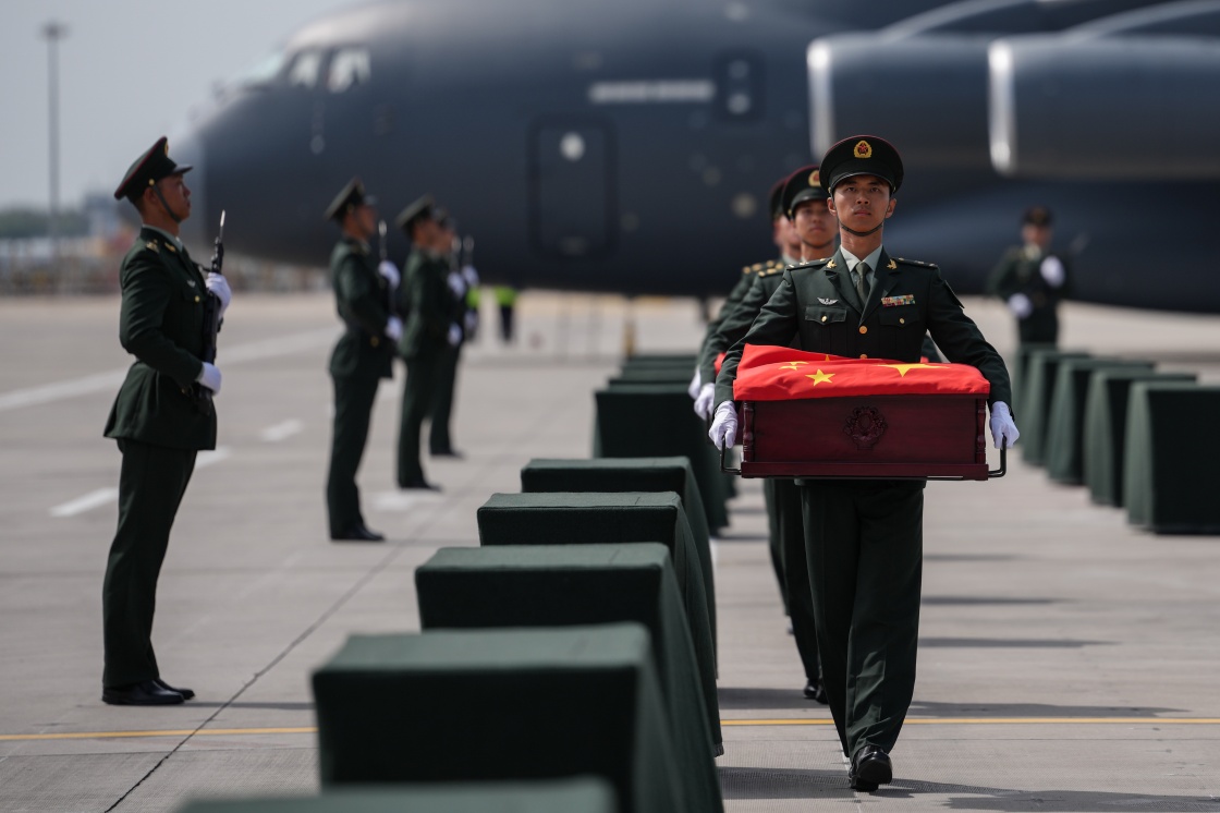 9月12日,第十二批在韓中國人民志愿軍烈士遺骸回國。這是空軍空降兵某部“黃繼光英雄連”官兵在沈陽桃仙國際機場舉行的迎回儀式上。新華社記者 潘昱龍 攝