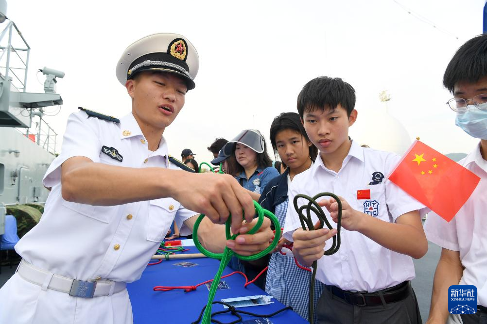 9月30日,參加艦艇開放活動的香港學生在戚繼光艦上學習打繩結。新華社記者 陳鐸 攝