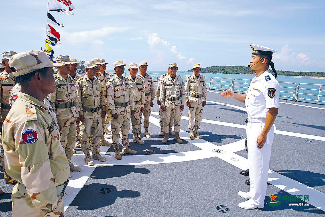 長(zhǎng)白山艦艦員向柬方海軍官兵介紹艦艇整體情況。甘 俊攝
