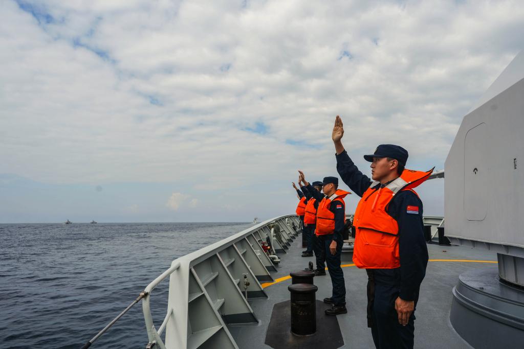 4日,雙方艦艇編隊抵達北部灣巡邏線終點,雙方艦艇組成雙縱隊齊頭并進,指揮員通過甚高頻互相致意,官兵在甲板上分區列隊揮手告別,聯合巡邏圓滿結束。