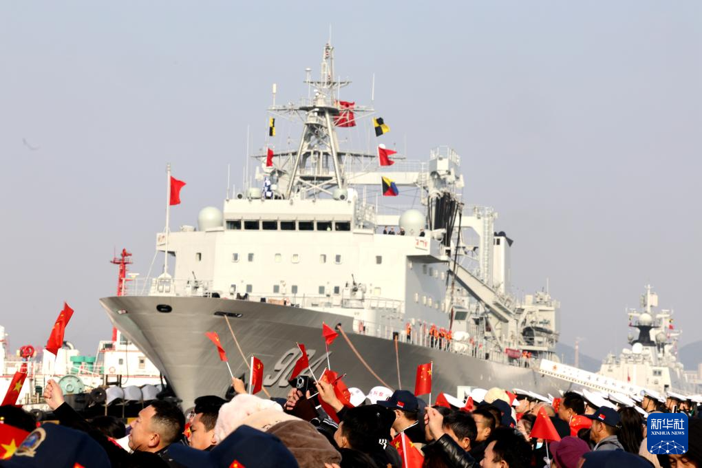 上午9時許,伴隨著嘹亮的軍樂聲,編隊艦艇依次解纜,緩緩駛離碼頭。甲板上,任務官兵整齊列隊,向祖國和親人揮手告別。