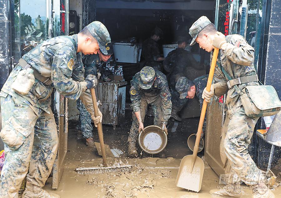 6月21日,武警安徽總隊黃山支隊官兵在歙縣開展清淤工作。曹瀏 攝
