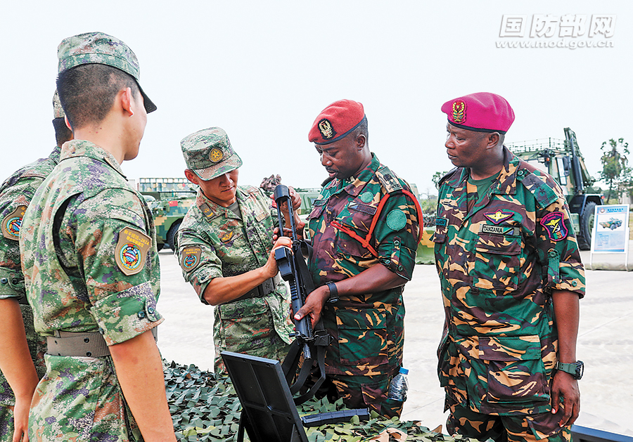 中方在開幕式結束后舉辦裝備展示活動,安排專人對7類23種典型武器裝備進行展示、講解。記者在現場看到,坦方參演官兵在中方講解員的介紹下,體驗水下步槍等中方武器裝備。在無人平臺操作區,多名坦方參演官兵圍攏過來,對操縱無人設備興致盎然。