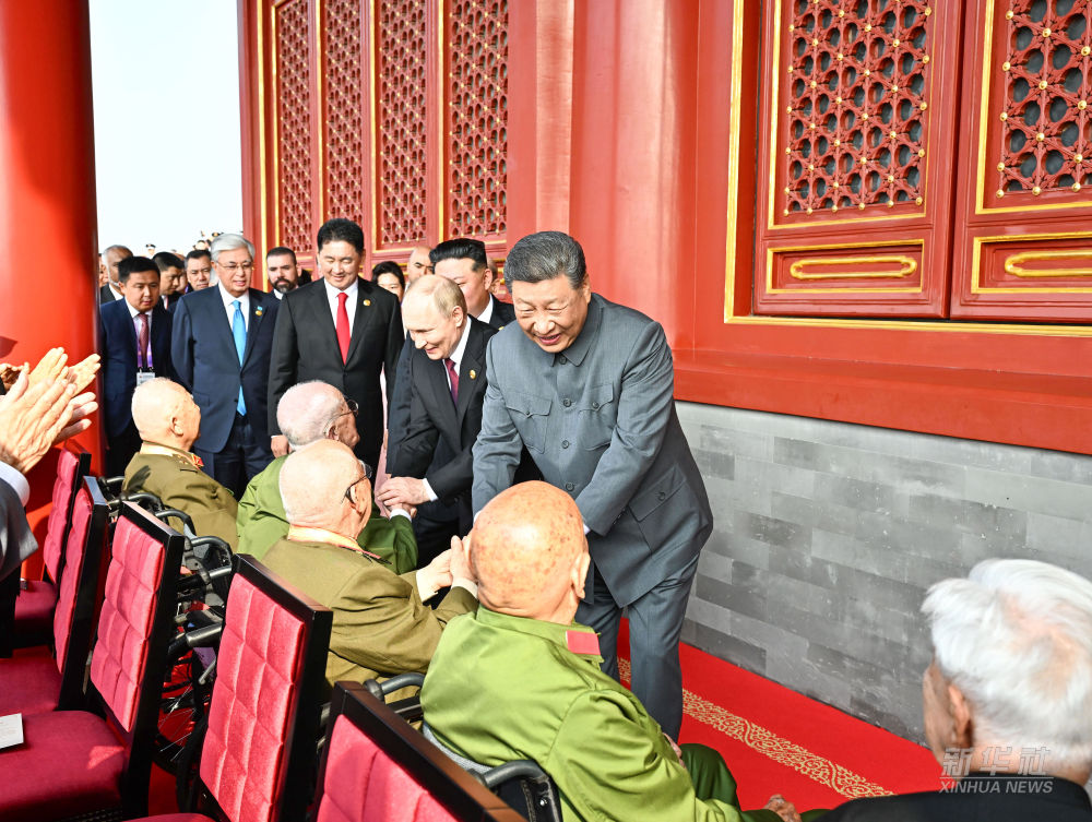 9月3日上午,習近平等登上天安門城樓。習近平同抗戰老戰士老同志代表親切握手,向他們表示崇高敬意。