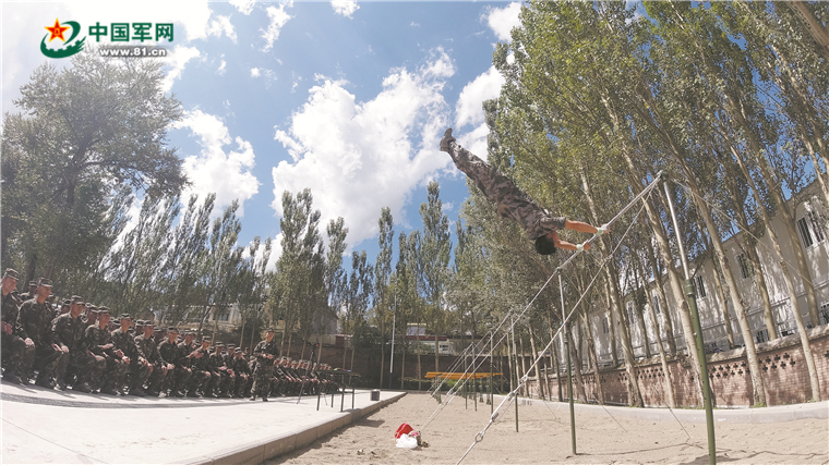 體操教練何云龍為火箭軍新訓(xùn)基地官兵做單杠8練習(xí)示范。李京鵬攝