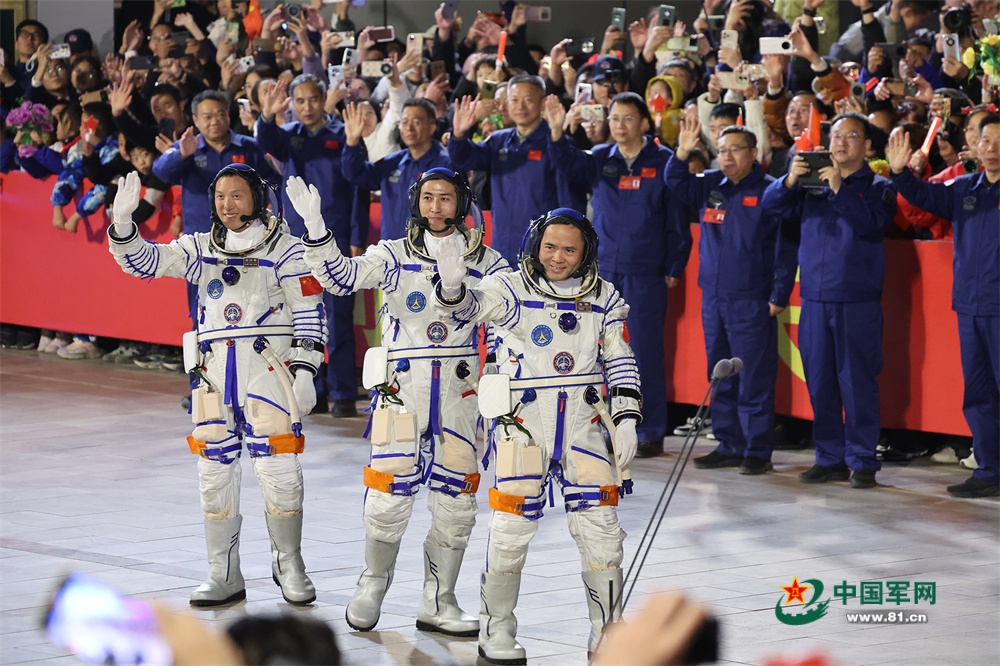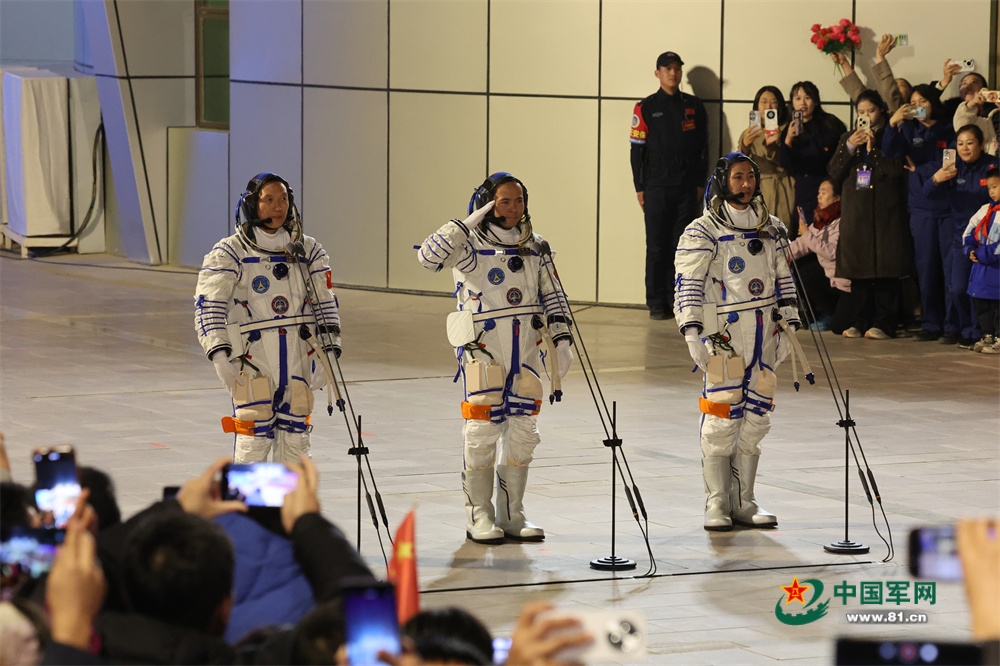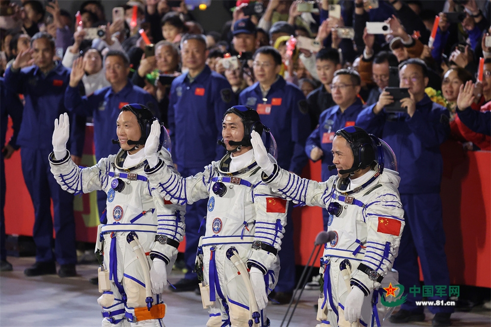 20時49分,張陸、武飛、張洪章3名航天員領命出征??臻g站應用與發(fā)展階段飛行任務總指揮部有關成員以及航天科技人員、各族群眾代表在現(xiàn)場為航天員乘組壯行。