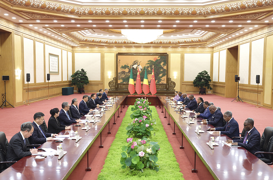 9月4日中午,國家主席習近平在北京人民大會堂會見來華出席紀念中國人民抗日戰爭暨世界反法西斯戰爭勝利80周年活動的剛果(布)總統薩蘇。