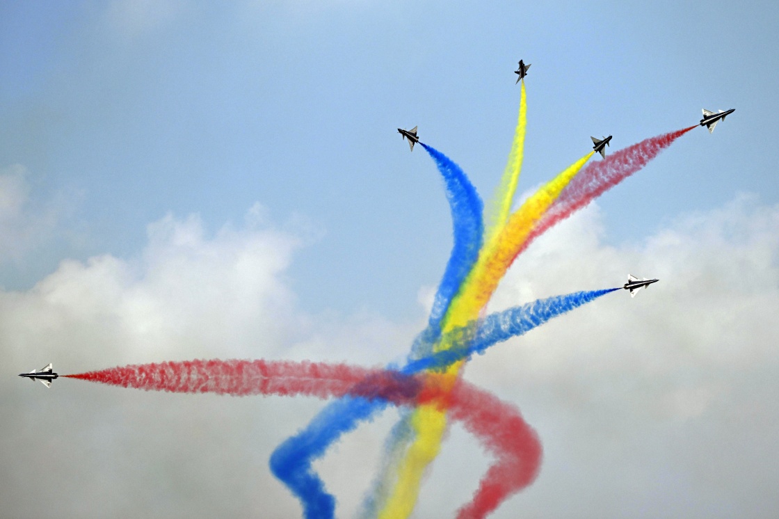 中國空軍八一飛行表演隊主要擔負國家空中禮儀護航、迎賓飛行表演、國內外巡回飛行表演等任務。自組建以來,該表演隊先后裝備過殲-5、殲-6、殲教-5、殲-7EB、殲-7GB和殲-10,今年3月正式換裝國產殲-10C表演機,5月,飛赴馬來西亞參加第十六屆蘭卡威國際海事和航空展,迎來“首秀”。