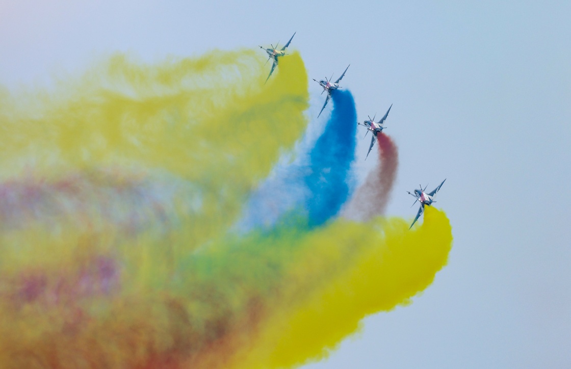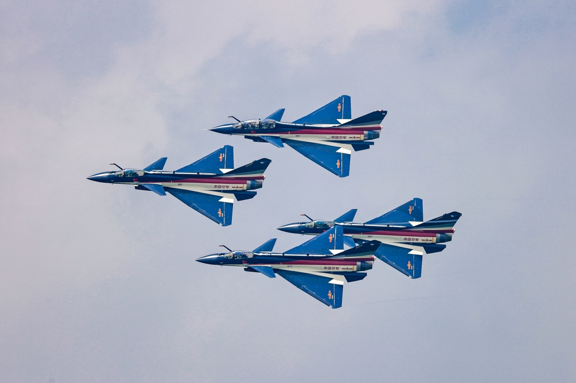 7月26日,在2023年空軍航空開放活動·長春航空展上,空軍八一飛行表演隊進行飛行表演。新華社記者 顏麟蘊 攝