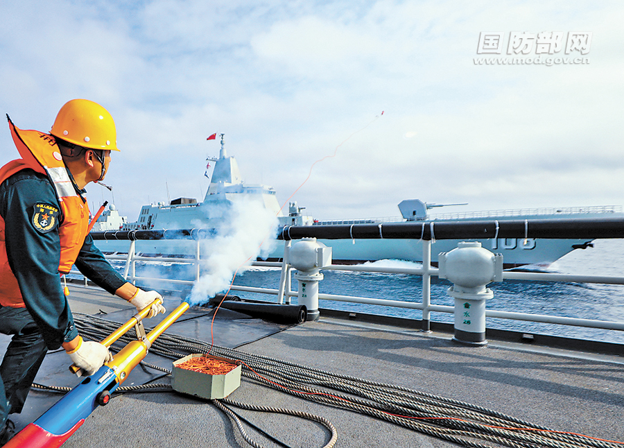 海空威脅剛解除,海上補給訓練隨即進行。駱馬湖艦快速轉(zhuǎn)換角色,展開補給部署;與此同時,三艘受補艦加速前出占領補給陣位,組成“兩橫一縱”補給隊形。對接、掃線、補給……各艦官兵密切協(xié)同,燃油源源不斷注入受補艦。