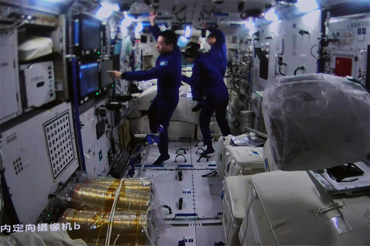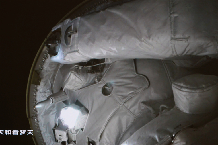 11月1日在北京航天飛行控制中心拍攝的空間站夢天實驗艙與空間站組合體在軌完成交會對接。這是夢天實驗艙成功對接于天和核心艙前向端口后,天和核心艙內的情況。新華社發(孫豐曉 攝)