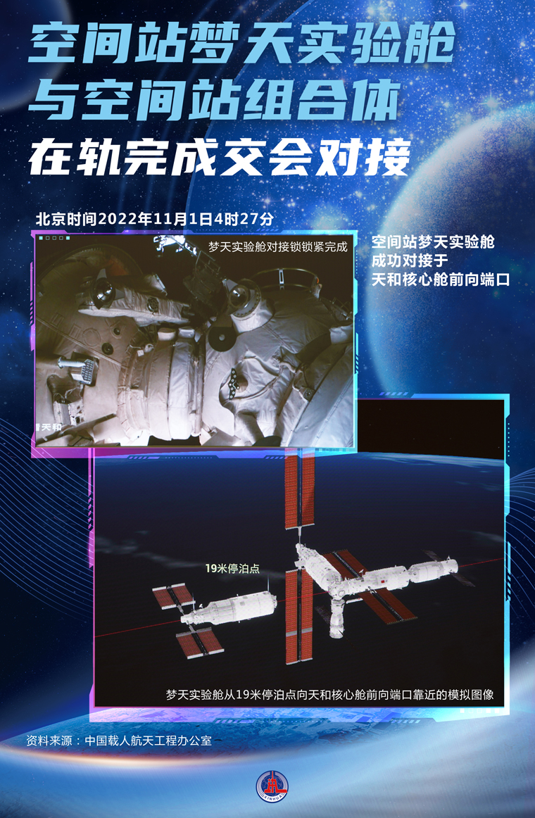 據中國載人航天工程辦公室消息,空間站夢天實驗艙發射入軌后,于北京時間2022年11月1日4時27分,成功對接于天和核心艙前向端口,整個交會對接過程歷時約13小時。