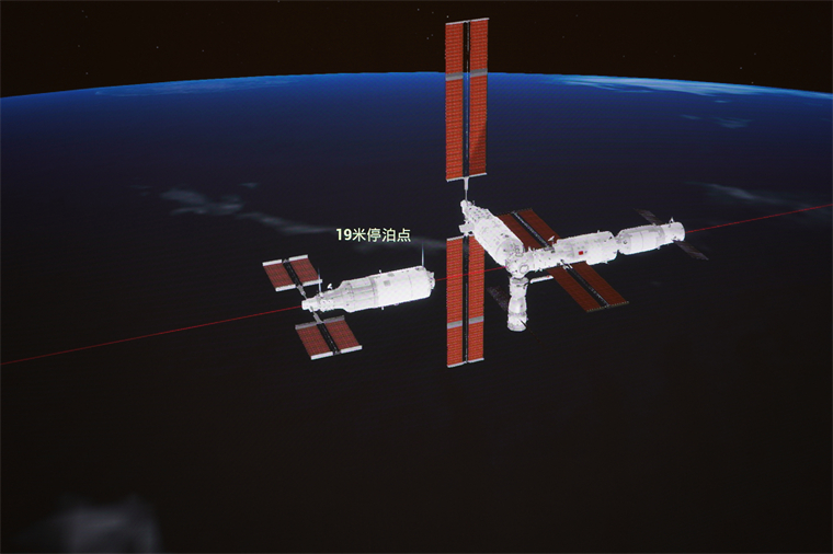 11月1日在北京航天飛行控制中心拍攝的空間站夢天實驗艙與空間站組合體在軌完成交會對接。這是夢天實驗艙從200米停泊點向19米停泊點靠近的模擬圖像。新華社發(孫豐曉 攝)