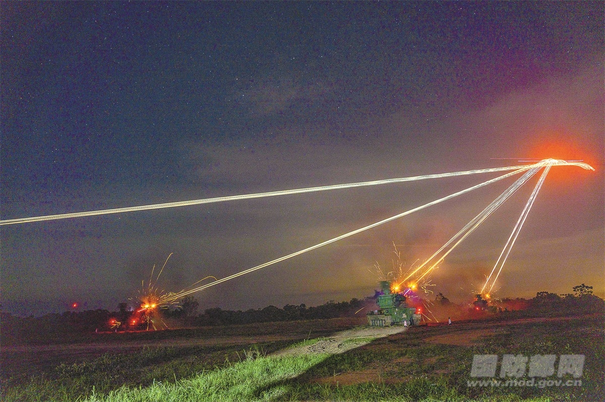 “占領(lǐng)陣地,實施警戒偵察!”地導(dǎo)分隊各作戰(zhàn)單元雷達(dá)迅速進(jìn)入對空值守狀態(tài)。夜幕降臨,“敵”機快速接近陣地。雷達(dá)操縱員緊盯屏幕,規(guī)避干擾,跟蹤捕捉目標(biāo)。隨著射擊命令下達(dá),導(dǎo)彈呼嘯而出,直撲目標(biāo)。