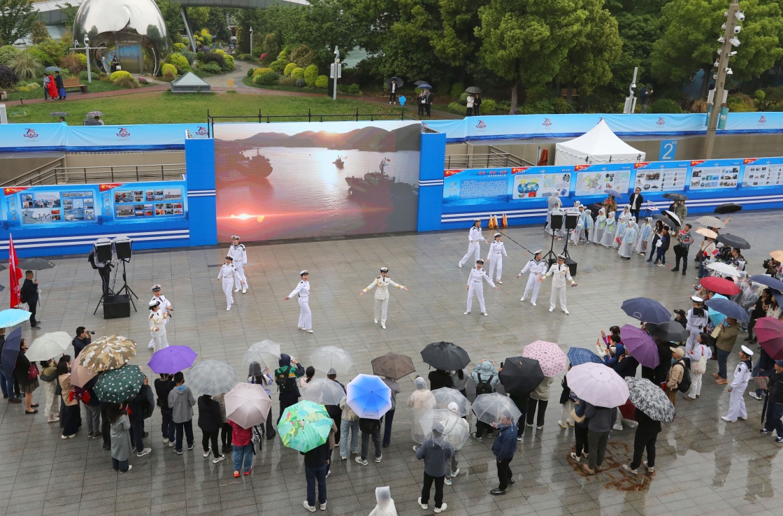 4月23日,前來參觀的市民游客在碼頭上觀看海軍戰士文藝演出。新華社記者 方喆 攝